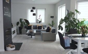 W salonie: rogówka, stolik, stół, 4 krzesła, szafka stojąca, TV Manta 65", kominek, panel na podczerwień.