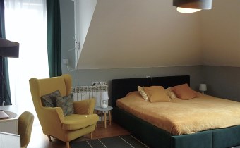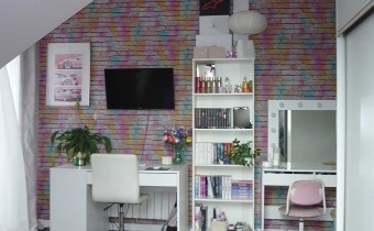 W pokoju: łóżko, biurko, siedzisko, fotel.