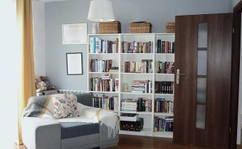 W pokoju: sofa, komoda, półki, 2 szafki.