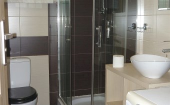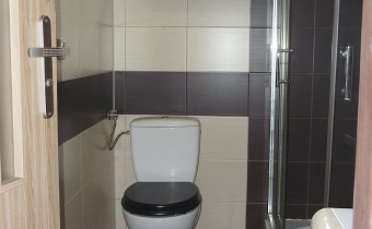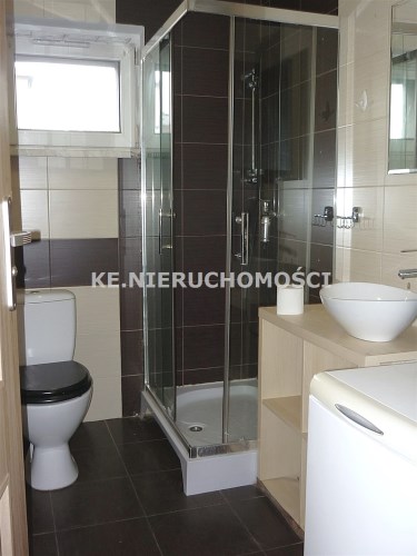 W łazience z WC: kabina prysznicowa, umywalka, toaleta, lustro, szafka wisząca, pralka(Whirlpool), bojler elektryczny.