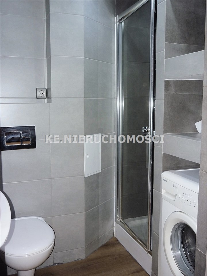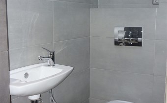 W łazience z WC: kabina prysznicowa z deszczownicą, umywalka, toaleta, bojler elektryczny.