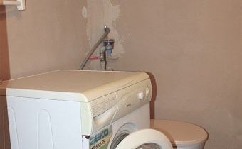 W łazience z WC: wanna, toaleta, pralka, lustro, piec gazowy.