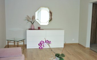 W pokoju: komoda, szafka, lustro, sofa, stolik, stolik szklany, kwietnik, TV.