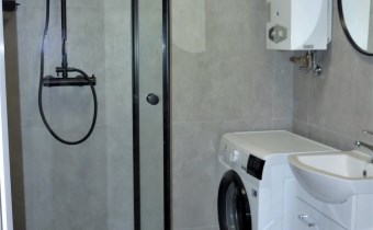 W łazience z WC: kabina prysznicowa z deszczownicą, umywalka z szafką, lustro, toaleta, pralka, piec gazowy.